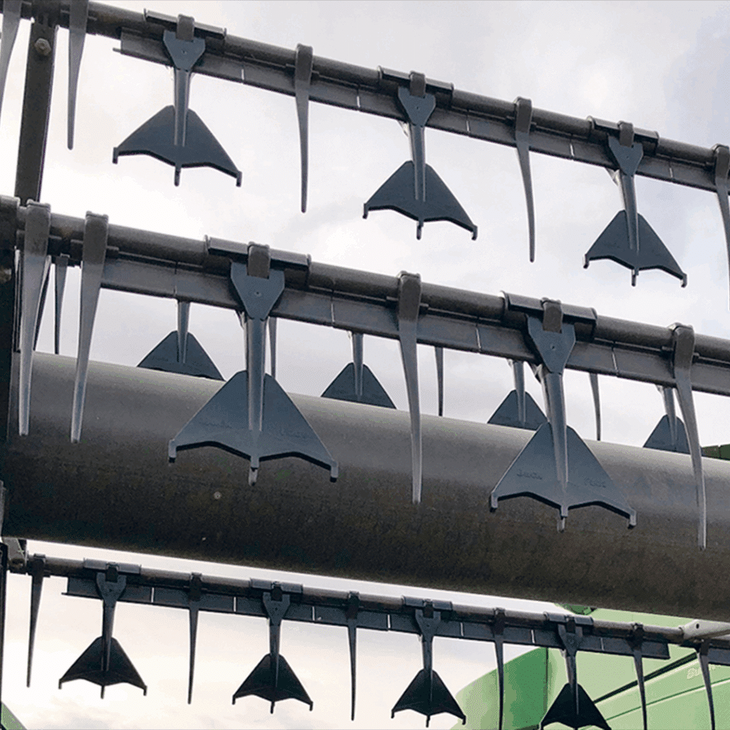 O Duck Foot é um adaptador patenteado que se encaixa sobre os dedos do molinete, melhorando o fluxo e a alimentação da colheitadeira. Resultado: menos perdas, mais velocidade e até 20% de aumento de produtividade.